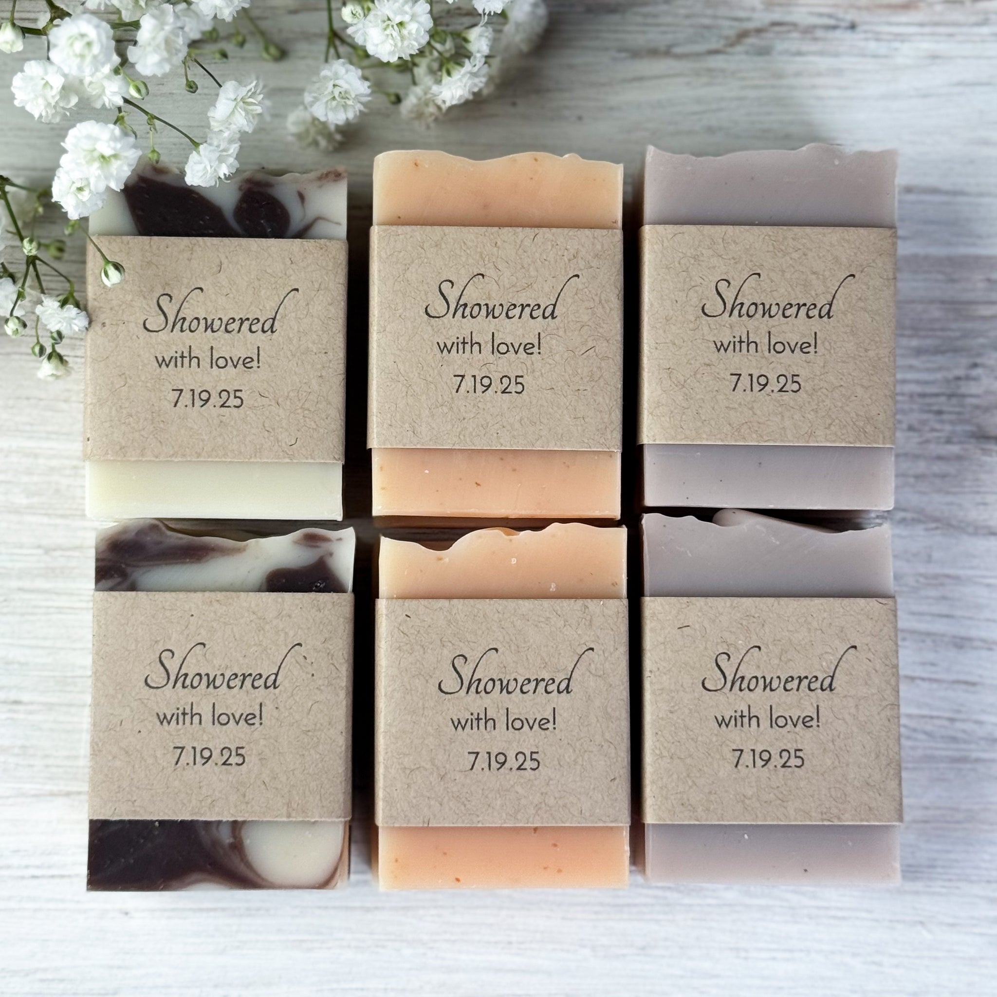 Choose one or more soap varieties currently listed in the shop and note your choice(s) at checkout. (Note: Please choose from the regular line of soaps. Sea Salt Bars, Shampoo Bars and Baobab Luxe Bars are excluded. If you are interested in those for favors, please contact us for packaging options and a quote.)